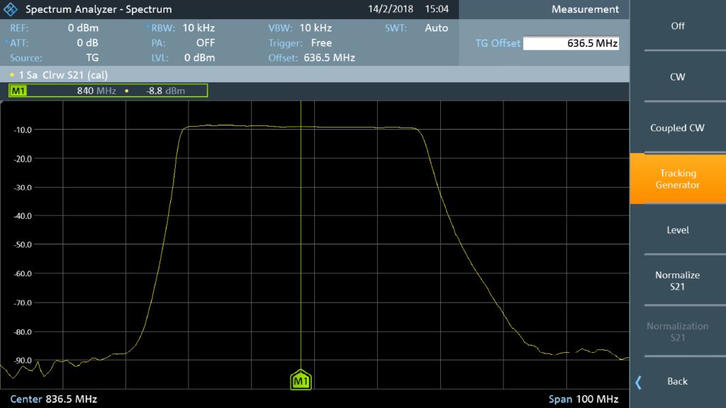 RF 엔지니어링에서는 증폭기, 필터, RF 케이블 등 자체적으로 RF 신호를 발생하지 않는 패시브 또는 액티브 RF 회로를 테스트해야 하는 경우가 많습니다. 독자적인 스펙트럼 분석기만으로는 충분하지 않으며 신호 발생기가 필요합니다. R&S®FPC1500에는 RF 필터 및 일반 주파수 응답 측정과 같은 전송 측정을 수행할 수 있는 Tracking Generator 기능이 탑재되어 있습니다.
